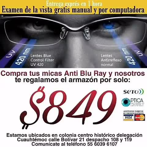 Lentes con servicio exprés de 1 hora la entrega en lente completo o solo las micas2 Lentes completos por 499 al 2 X 1¿Que incluye la oferta?2 Armazones2 par de Micas ya con graduación2 Estuches2 Paños Examen sin costó Tratamiento antirrayasPromoción de $499Contamos con armazones de marca, línea y económico.Contamos con el servicio exprés de entrega de lentes en 1 hora y en este momento te estamos atendiendo por cita a los teléfonos: 5560396107Te hacemos el examen de la vista totalmente grátis, y contamos con el examen manual, retinoscopía y claro el examen por computadora (Autorrefactometro).Te garantizamos nuestro trabajo desde micas, armazón, lentes de contacto y claro que te dejaremos satisfecho, porque ver bien es lo que queremos hagas.Estamos ubicados en colonia centro histórico delegación Cuauhtémoc calle Bolivar 21 despacho 119.Comunícate al teléfono 55 6039 6107.Aplica restricciones